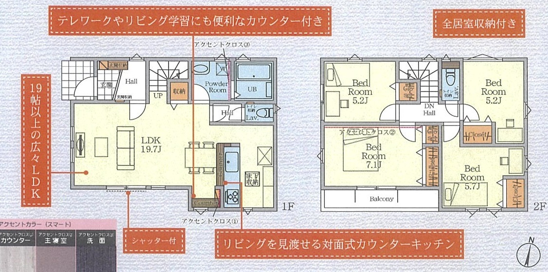 | 間取 | 4LDK (LDK19.7帖、洋室7.1帖、洋室5.7帖、洋室5.2帖、洋室5.2帖) | ||