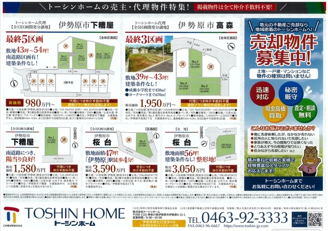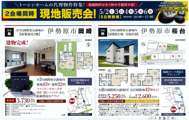 トーシンホームトップページ現地販売会開催いたし... News & Topics 2026年4月27日 現地販売会開催いたします♪ 5月2日(土)~6日(水) 10:00~17:00 現地①伊勢原市岡崎 ←コチラをクリックすると詳細が閲覧できます 現地②伊勢原市桜台 ←コチラをクリックすると詳細が閲覧できます 表 裏 ご興味ございましたら現地販売会に足をお運びください♪ また、お電話でもお気軽にお問合せお待ちしております! NEW